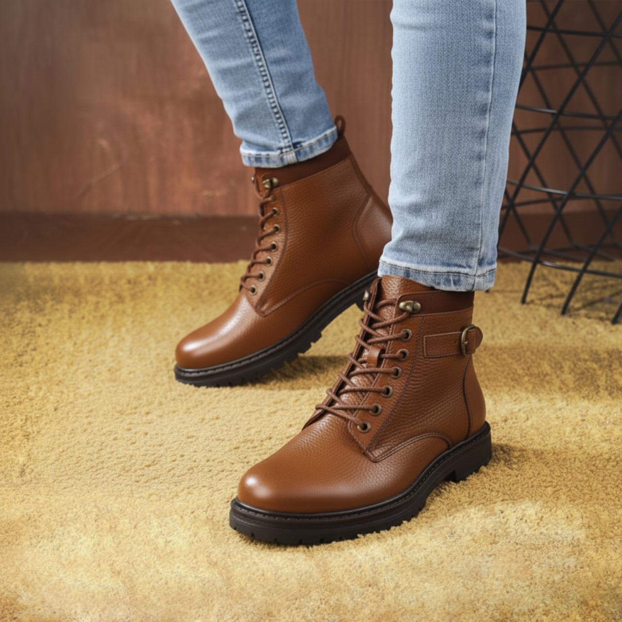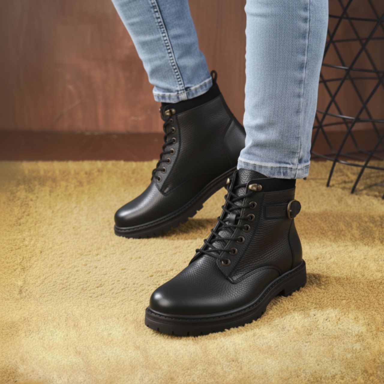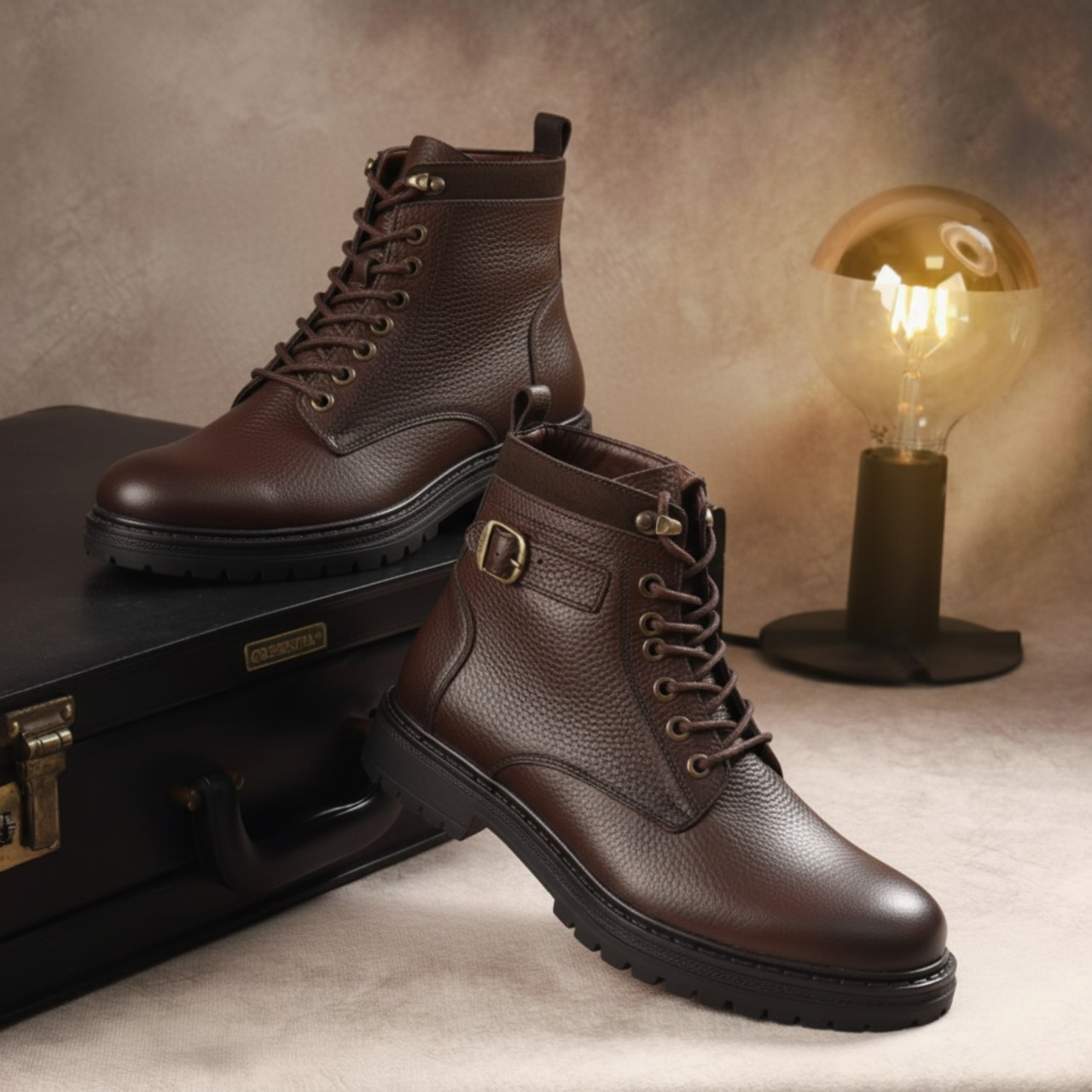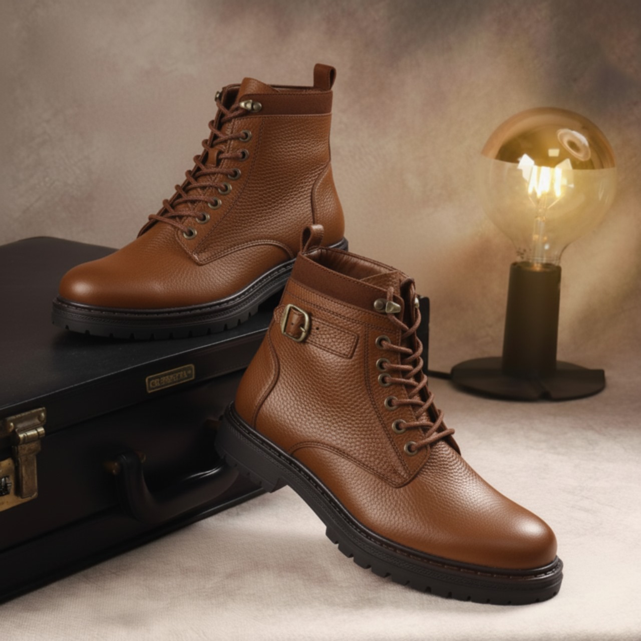 الهَاف بوت ده معمول من جلد طبيعي متكامل — مش جلد “رخيص” — علشان يعطيك مظهر أنيق ومتين في اللبس اليومي والشتوي. البطانة الداخلية مريحة على الرجل وبتدي إحساس نعومة من أول ما تلبسه. النعل (Ruber-نعل) متين وثابت، بيضمن ثبات في الخطوة مهما المكان كان — شوارع، خروجات مساء، أو مشاوير الشغل.
